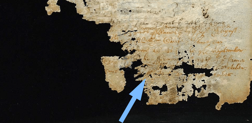 Myngs is included in the baptisms in the Salthouse register for 1625-6. The entry for Christopher Myngs is the final one, indicated by the arrow. Unfortunately, the parchment in this part of the register has badly denatured and most of the entry has been lost. Little more than the name ‘Minge’ can be read.