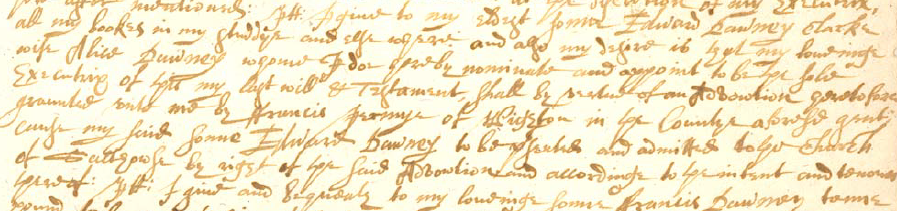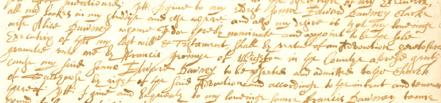 ‘Ittem I give to my eldest sonne Edward Dawney clarke all my bookes in my studdye and else where and also my desire is that my loveinge wife Alice Dawney whome I doe hereby nominate and appoint to be the sole Executrix of this my last will and Testament, shall by vertue of an Advowtion heretofore graunted unto me by Francis Jermye of Wighton in the Countye aforesaid gentleman cause my said sonne Edward Dawney to be presented and admitted to the church of Salthowse by right of the said Advowtion and accordinge to the intent and tenour thereof’.