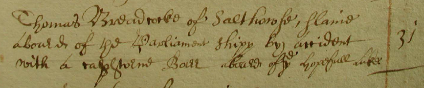 Thomas Breadcocke of Salthowse, slaine aboard of the Parliament Shipp by accident with a capstorne Barr aboard of the Hopefull Luke