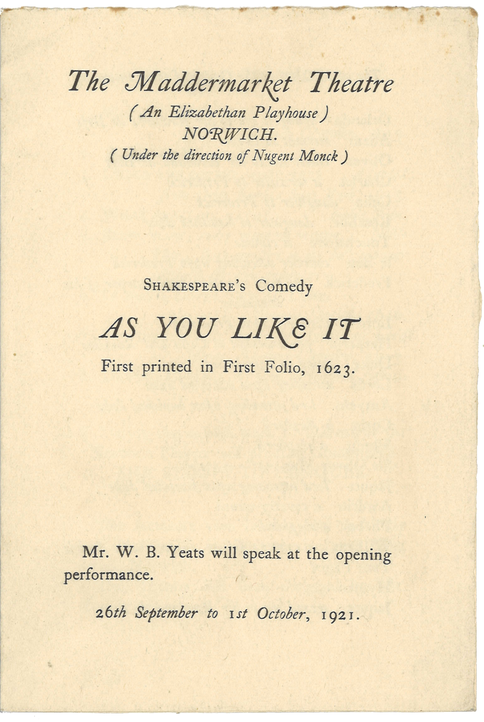 - Borrow, George H. and Farrell, Frank J. 26 September to 1 October 1921. Programme for a production of ‘As You Like It’ at the Maddermarket Theatre, at the opening performance of which W.B. Yeats was to speak, printed. Item MS 11322/1131, Box VI, Fonds MS 11322. Norfolk Record Office, Norwich.