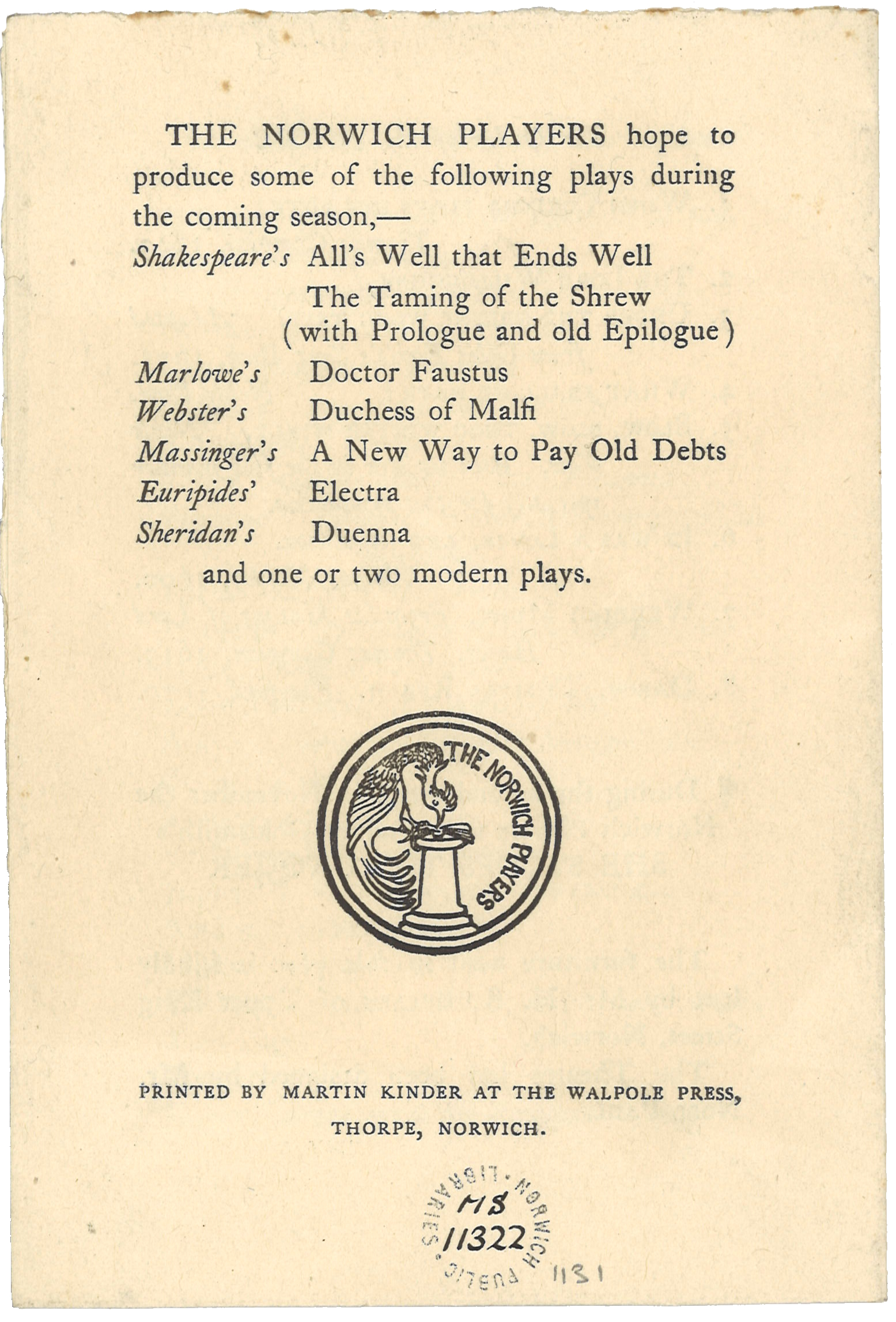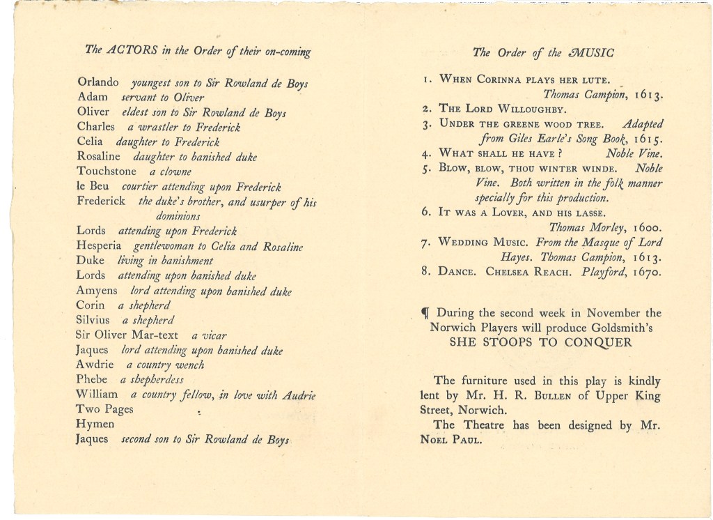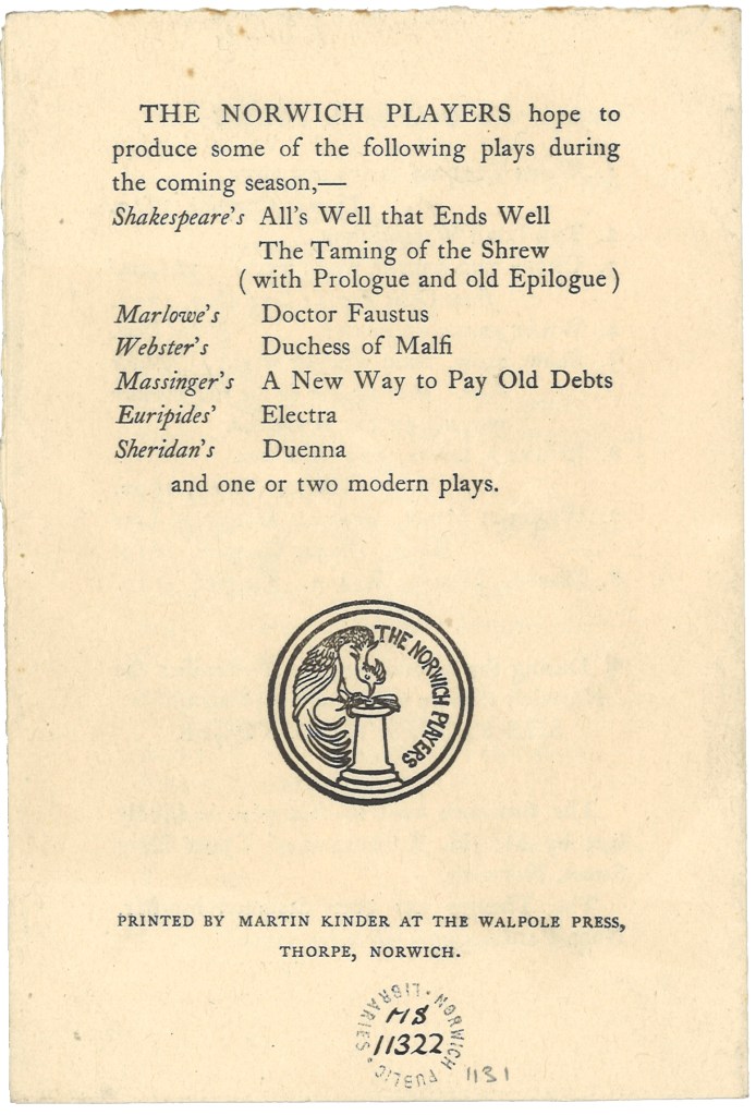 What a perceptive, interesting and well – written piece! It shows how valuable a piece of archival material can be and how much can be derived from it. It pays tribute to Nugent Monck’s pioneering work in Norwich, first at The Music House (aka Wensum Lodge) and then at The Madermarket. I suspect that it’s not widely realised in Norwich how influential he was nationally in restoring Shakespearean productions to something like their Elizabethan style with an open stage. And I also noticed on the programme that no less a person than the famous poet, W.B.Yeats was present on the first night, no doubt because of his work with the Abbey Theatre in Dublin.