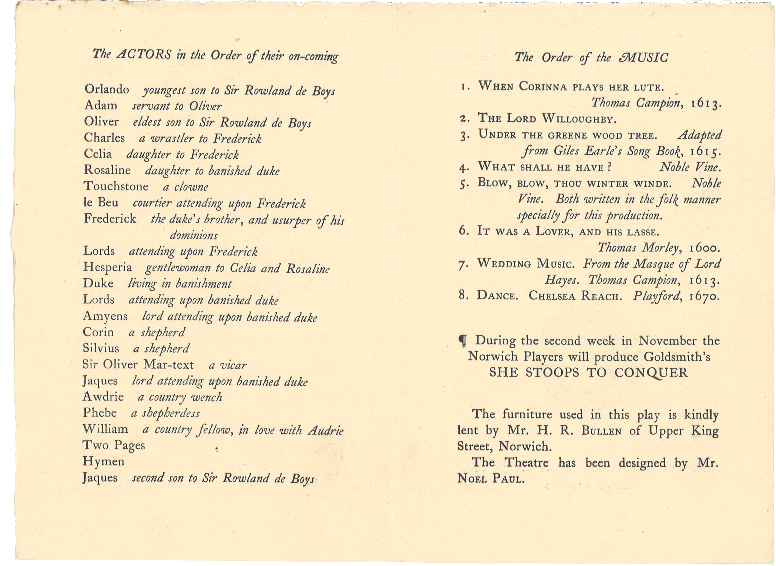 The contents of the programme might also provide a few indications of Monck’s artistic choices in his production of As You Like It (NRO, MS 11322/1131). For one, there is a tangible lack of specificity in a few areas of its contents that might give us information about the performance outside of its fictionality – for example, a list of the characters is provided, but with no detail on who they are performed by. This may have been done to remove some element of realism and engage the audience fully in its fantasy tale, one that felt as if it could’ve taken place in another time. The music list is also intriguing – if we view the play as trying to recreate Shakespearean theatre, we can see references such as “Wedding Music- From the Masque of Lord Hayes. Thomas Campion, 1613”- the traditional form of courtly entertainment and performance, melodies from a masque would make an enchanting entrance into both the disorderly forest of Arden and the imaginative world of Renaissance theatre (Shakespeare Birthplace Trust, n.d.) Only details such as under “What Shall He Have? Blow, Blow Thou Winter Winde” indicate “Noble Vine. Both written in the folk manner specially for this production,” giving a vague suggestion of what kinds of instruments may have been used for the production. There is no written description of the plot of the play, either, and perhaps this lack of detail provides an indication that even the programme incorporated Monck’s directive vision, to enhance the illusory experience of the play and completely absorb the audience watching. Given the acoustic capacity and intimacy of the space, the music of Under the Greenwood Tree, also adapted from a seventeenth century piece, would have filled the room. One autumn night, the theatre perhaps became a fantastical world of folk melodies and romance, with the power of Shakespeare’s language reverberating around a space transported to another time- just like those in the audience, we could only imagine what that piece of history might have felt like.