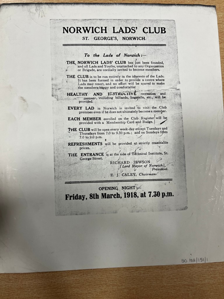 youngsters’. (reference of document: A History of Norwich Lads Club 1918-1988, NRO, SO