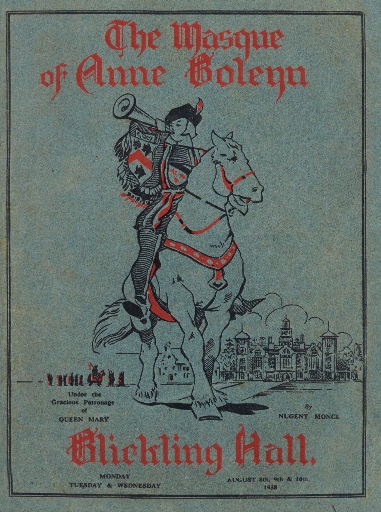 The estate who held this spectacular pageant was Blickling Hall, a stunning Jacobean mansion on the outskirts of Aylsham, which is now owned by the National Trust, but was once owned by the Boleyn family. The current hall that stands there today was built on the ruins of the property owned by Thomas Boleyn, (Anne’s father) (1), so there is no surprise that Blickling Hall was chosen to stage a play dedicated to a Queen .Iit was the perfect backdrop, as not only does the hall have the strong family links but also made use of the hall’s exterior splendour and eerie aura. It is widely speculated that the ghost of Anne Boleyn haunts the site and is said to be seen all dressed in white, “carrying her severed and dripping head as she arrives by coach, also driven by a headless horseman and four headless horses, to the hall.” (2) The pageant itself was written by (Walter) Nugent Monck who was an actor/theatre director and founder of the well-known Maddermarket theatre in Norwich in 1921 (3). The pageant was performed in 1909 again in 1925, with the last performance being held in 1938. As you can see below from a publicity flyer held at the Norfolk Record Office, the 1938 pageant was attended by Queen Mary, who was Queen Elizabeth 1st’s grandmother. Nugent Monck’s plays must have been superb to attract such esteemed visitors, which as a result must have drummed up quite a bit of publicity to view not only the pageant but a chance to see the Queen in person. What a great honour for the people of Aylsham and the staff of Blickling Hall, not to mention this publicity must have had a positive contribution in raising the funds needed for the church.