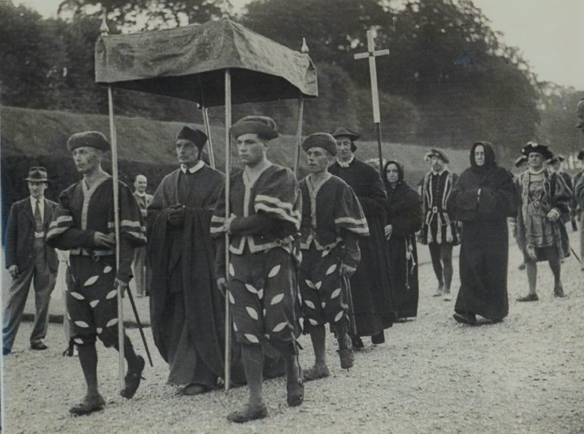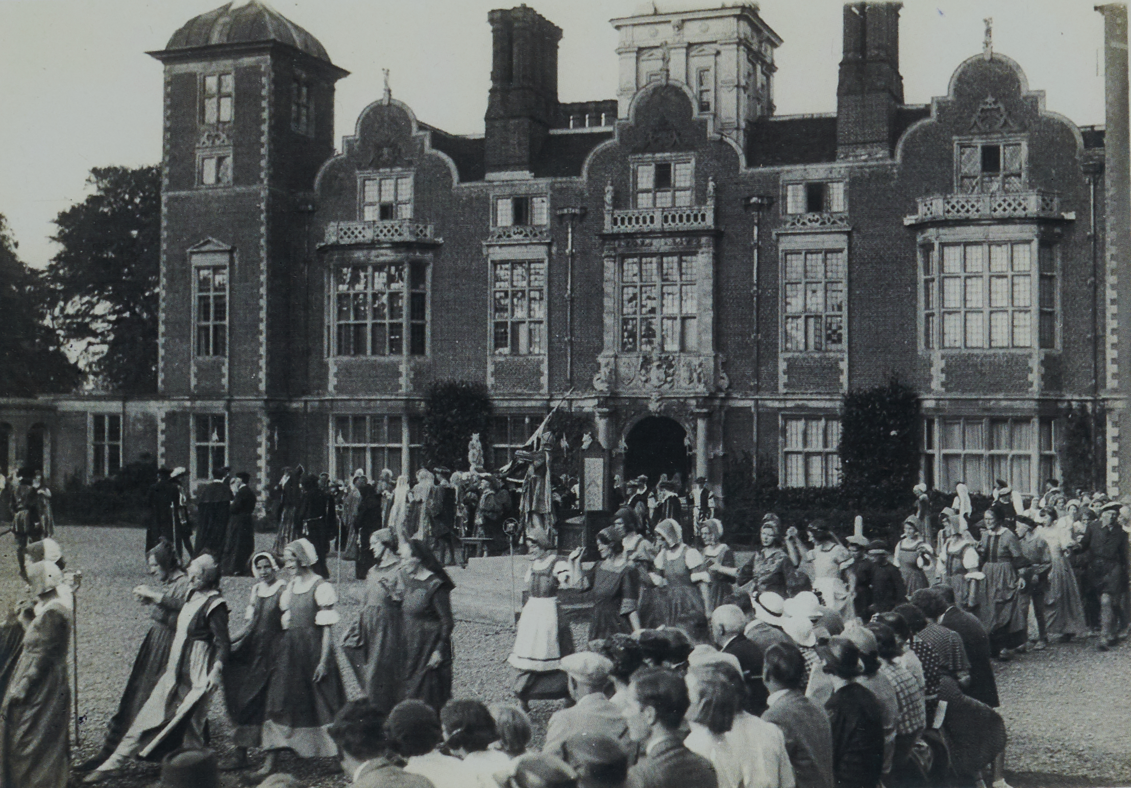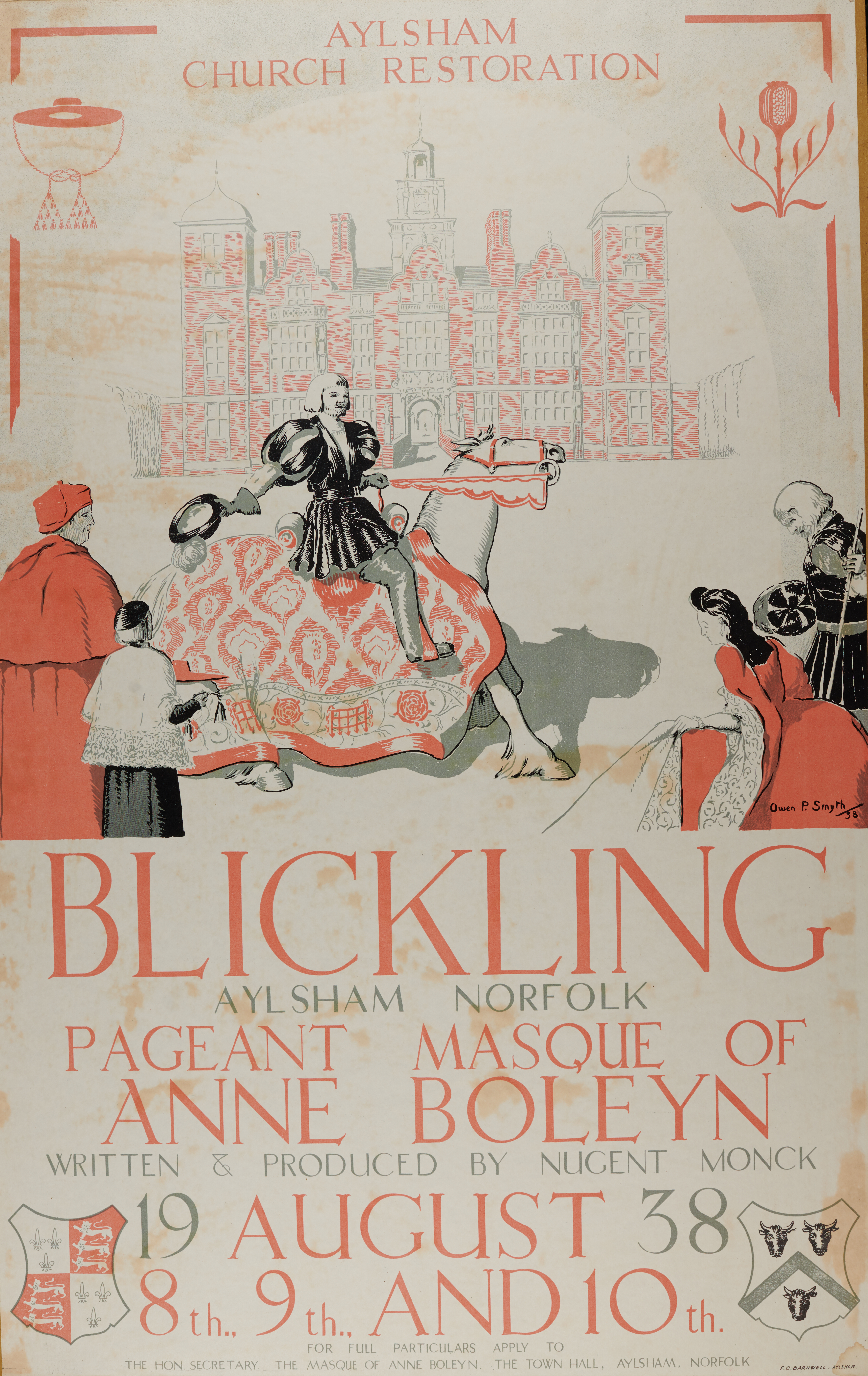 The estate who held this spectacular pageant was Blickling Hall, a stunning Jacobean mansion on the outskirts of Aylsham, which is now owned by the National Trust, but was once owned by the Boleyn family. The current hall that stands there today was built on the ruins of the property owned by Thomas Boleyn, (Anne’s father) (1), so there is no surprise that Blickling Hall was chosen to stage a play dedicated to a Queen .Iit was the perfect backdrop, as not only does the hall have the strong family links but also made use of the hall’s exterior splendour and eerie aura. It is widely speculated that the ghost of Anne Boleyn haunts the site and is said to be seen all dressed in white, “carrying her severed and dripping head as she arrives by coach, also driven by a headless horseman and four headless horses, to the hall.” (2) The pageant itself was written by (Walter) Nugent Monck who was an actor/theatre director and founder of the well-known Maddermarket theatre in Norwich in 1921 (3). The pageant was performed in 1909 again in 1925, with the last performance being held in 1938. As you can see below from a publicity flyer held at the Norfolk Record Office, the 1938 pageant was attended by Queen Mary, who was Queen Elizabeth 1st’s grandmother. Nugent Monck’s plays must have been superb to attract such esteemed visitors, which as a result must have drummed up quite a bit of publicity to view not only the pageant but a chance to see the Queen in person. What a great honour for the people of Aylsham and the staff of Blickling Hall, not to mention this publicity must have had a positive contribution in raising the funds needed for the church.