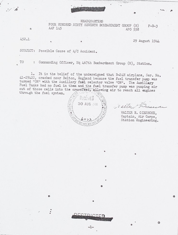 August 1944. MC 376/200 USF 11/7. 467th Bomb Group, image 3 of 45. ↩︎ - Description of aircraft accident. Documents and photographs relating to the crash of B-24 ‘Belle Of The