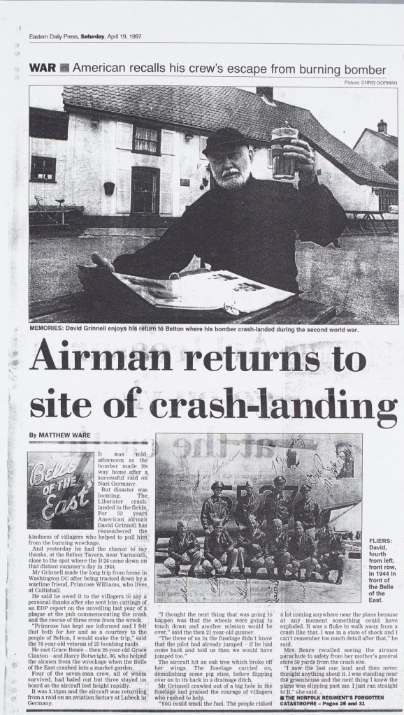That was until 54 years later, when Waist Gunner Charles Grinell returned to the village from his home in Washington DC, to give his belated thanks, and to meet some wartime friends he made who were living at Coltishall. The story made the Eastern Daily Press and can be seen below: