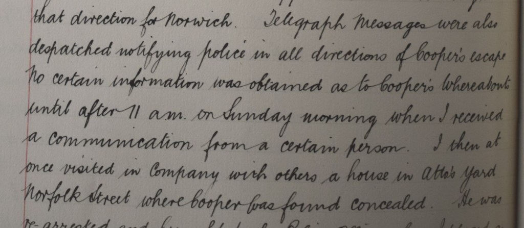 After John escaped from the small hole in the cell wall he made a quick getaway, but to no special or safe place from anyone looking for him. When the authorities found out he had escaped the Chief Constable sent police on bicycles in every direction and were searching high and low for him, including his parents’ house. Telegraph messages were sent to neighbouring forces to be on the lookout for him. However, John was found at 11am the next day hiding under a bed in Atto’s yard. The police were tipped off to his whereabouts/hiding space by a “certain” person and was caught quickly thereafter. He was returned to gaol, charged the following day with gaol breaking as well as theft, and then sent to be held at Norwich Gaol after he made repeated comments about escaping again. The whole incident had to be reported to the Borough’s Watch Committee and recommendations made to avoid a repeat incident.