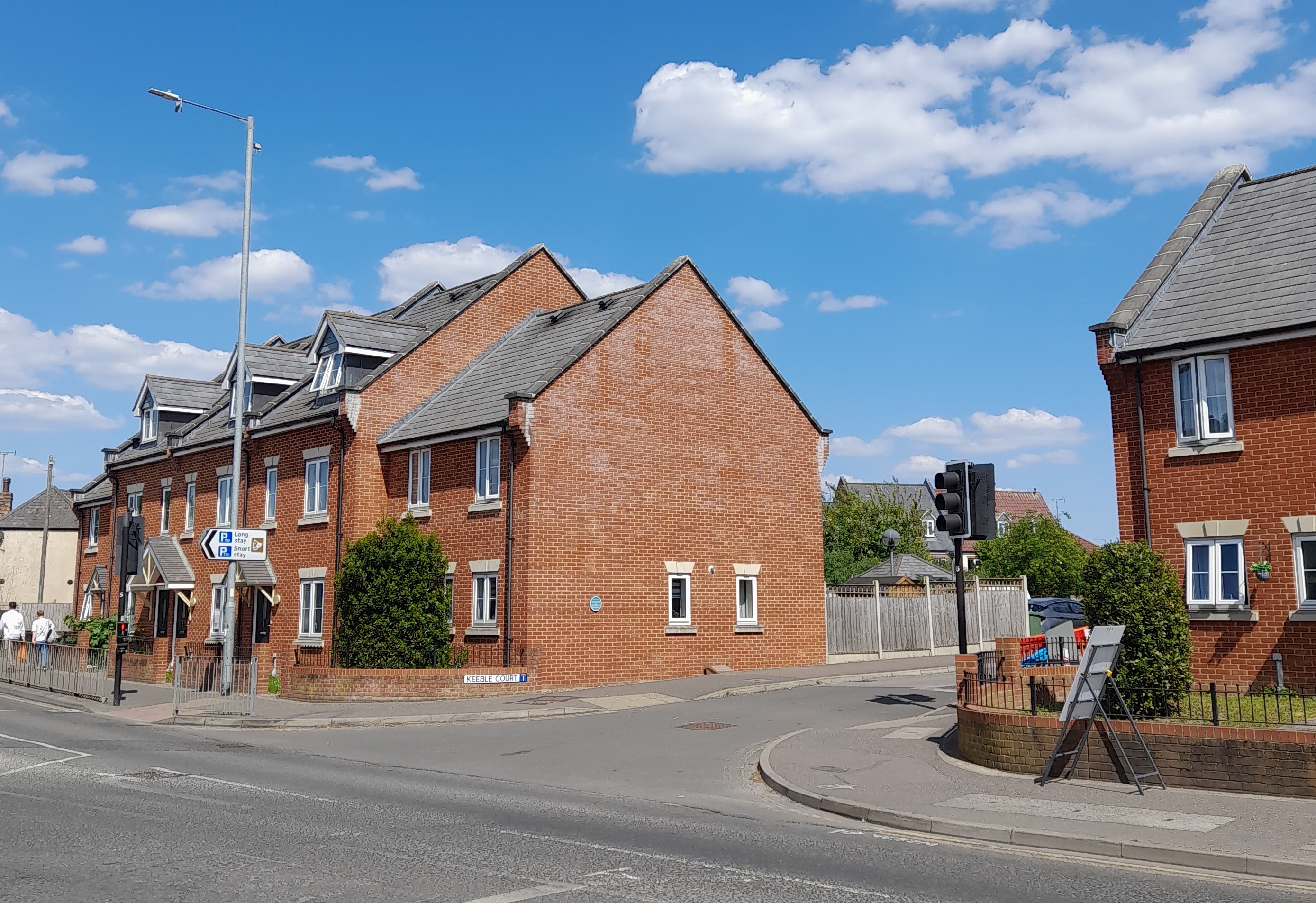 The above and the following photo are current ones taken by the author. The Majestic is still used as a cinema and has a number of screens. The above photo was taken in 2025, showing building work in the adjoining area which will become the new town library later in 2025. However, the Pilot was demolished in 2014 and the following housing was built in its stead. Interestingly, the same architectural firm who designed the Pilot also designed and built these houses. A nod to the Pilot, and the architect who designed it, appears in the name Keeble Court: “By naming the new estate road ‘Keeble Court’ after Keeble Allflatt, Kings Lynn Council have literally written into the landscape a small but significant piece of information about the history of King’s Lynn that will last for decades to come” (Chass D Allflat).[5]
