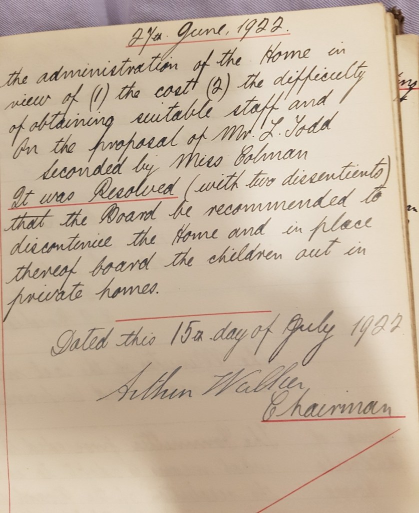Although the Home appeared to be well run in its early years, in March 1920 the Foster Mother and her Assistant were asked to resign following concerns about the children’s welfare, in particular the children not being fed adequately and not in accordance with the dietary table laid down by the Board – only 10 pints of milk and 4 eggs a week were being provided for 19 people, meat was not being supplied and children were not being allowed to eat after their breakfast of bread and milk. The Medical Officer also recommended better nourishment and more opportunities for fresh air, exercise, amusement with toys, and less strict discipline.