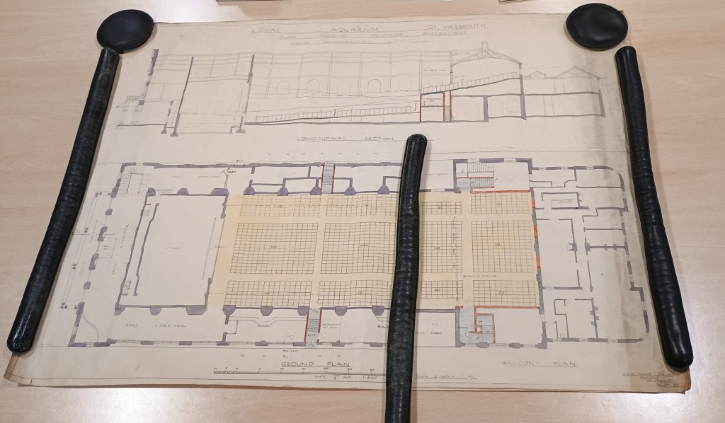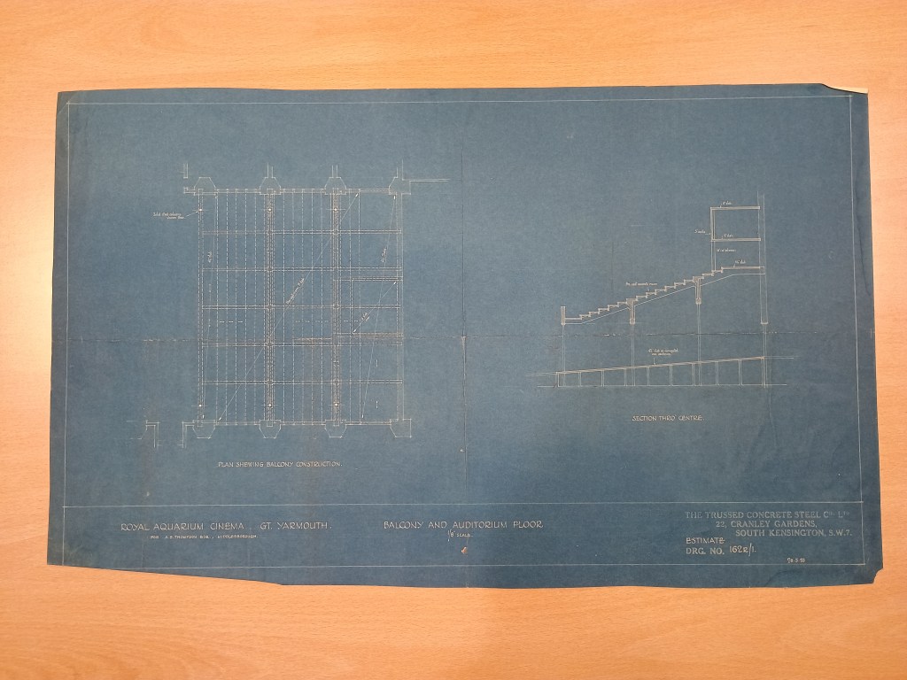The NRO also possesses a blueprint from 1933 neatly illustrating the internal structure of the balcony (NRO, BR 35/2/36/4). Notably, the blueprint is titled ‘ROYAL AQUARIUM CINEMA , GT. YARMOUTH.’ – at some point down the line, the Aquarium had clearly transformed again. From the fact that it was necessary to increase the seating, one could assume that there was confidence in its future once more.