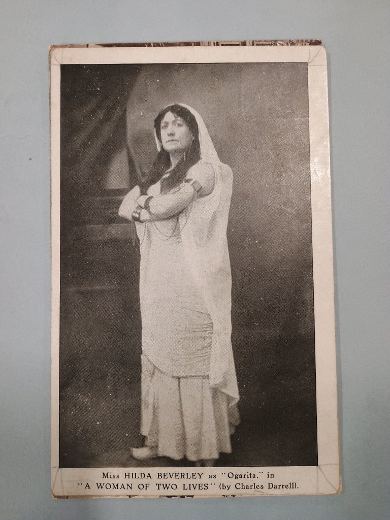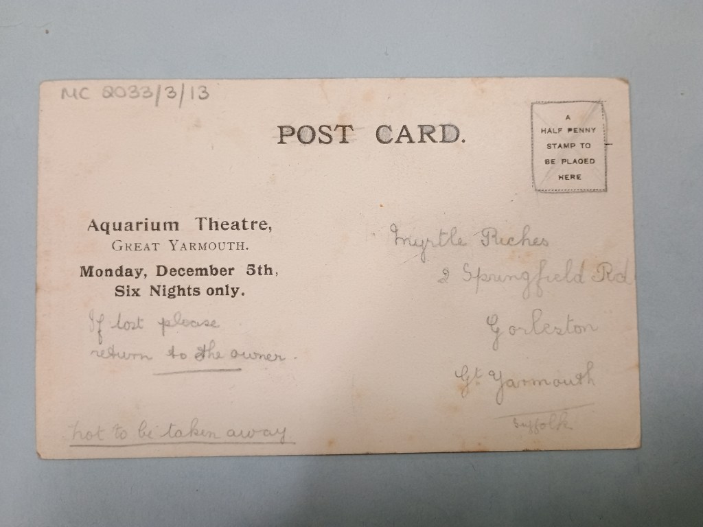 A postcard shows us a glimpse into an Aquarium performance (NRO, MC 2033/3, 901X9). A woman stands two-thirds to the camera in stage costuming, her dark hair framing the somewhat challenging expression on her face. On the reverse side of the postcard lies the owner’s address, and the handwritten inscriptions ‘if lost please return to the owner.’ ‘not to be taken away’, both firmly underlined. Here, the building still bears the title ‘Aquarium Theatre’ – was this postcard perhaps from before the cinema era, or was this a holdover? Did the owner, who seems to have valued it dearly, see this play? Or did they simply receive and cherish the postcards?