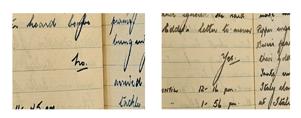 Most of the entries follow a standard format. Dennis begins by outlining the events in his day, chiefly relating to work and his personal life, but often describing local events to do with the war. In the following section of each entry, Dennis would summarise the news from the press, tracing political and military events abroad. At the end of each entry, Dennis would write ‘Yes’ or ‘No’. When first reading the diary, it’s not immediately apparent what Dennis means by writing ‘Yes’ or ‘No’. Close reading of the diaries reveals that this was Dennis’s way of recording whether or not he’d had an orgasm that day (on his own or with a sexual partner). Most days ended with ‘no’. He also used the word ‘reading’ to describe masturbation. This code was at times subtle and elegant, obscuring embarrassing references should anyone catch a glimpse of the diary. But it must be said, for anyone reading more closely, the code hardly obscures anything, as on 8 August, when Dennis wrote that he ‘“Read” twice this morning in bed’.