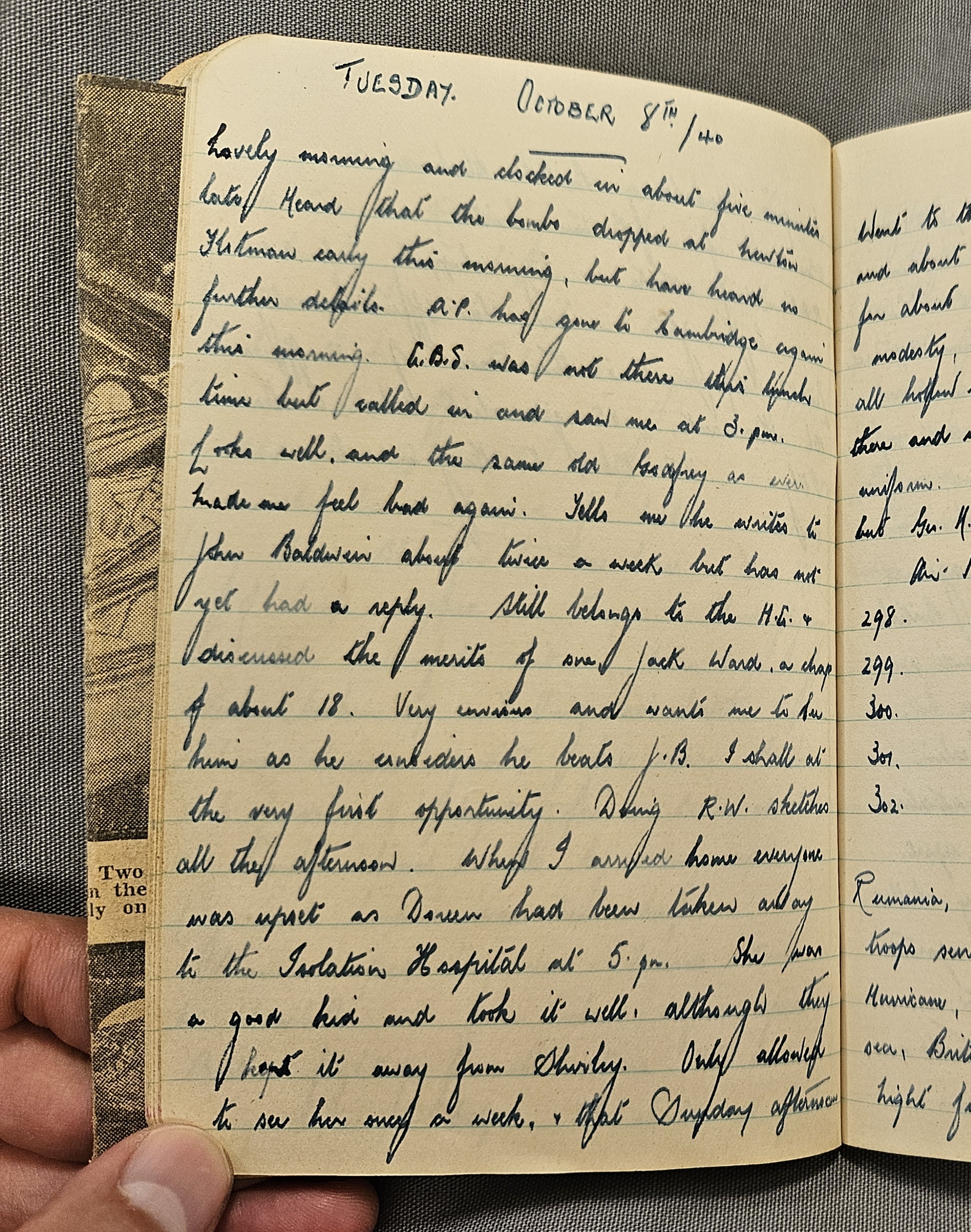 [Symonds] tells me he writes to John Baldwin about twice a week but has not yet had a reply. Still belongs to the H[ome] G[uard] + discussed the merits of one Jack Ward, a chap of about 18. Very envious and wants me to see him as he considers he beats J[ohn] B[aldwin]. I shall at the very first opportunity.