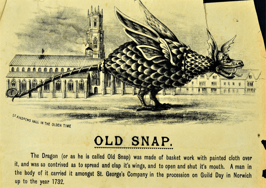 The new Company reflected this trend: in 1552, it was ordered George would no longer appear in the procession, ‘but for pastime, the Dragon to come and show himself in other years’. This is the origin of Snap the Norwich dragon who appeared in mayoral processions down to 1835, and who can still be seen in the Castle Museum. Unlike in the legend, in Norwich, it was the dragon who survived, rather than Saint George!
