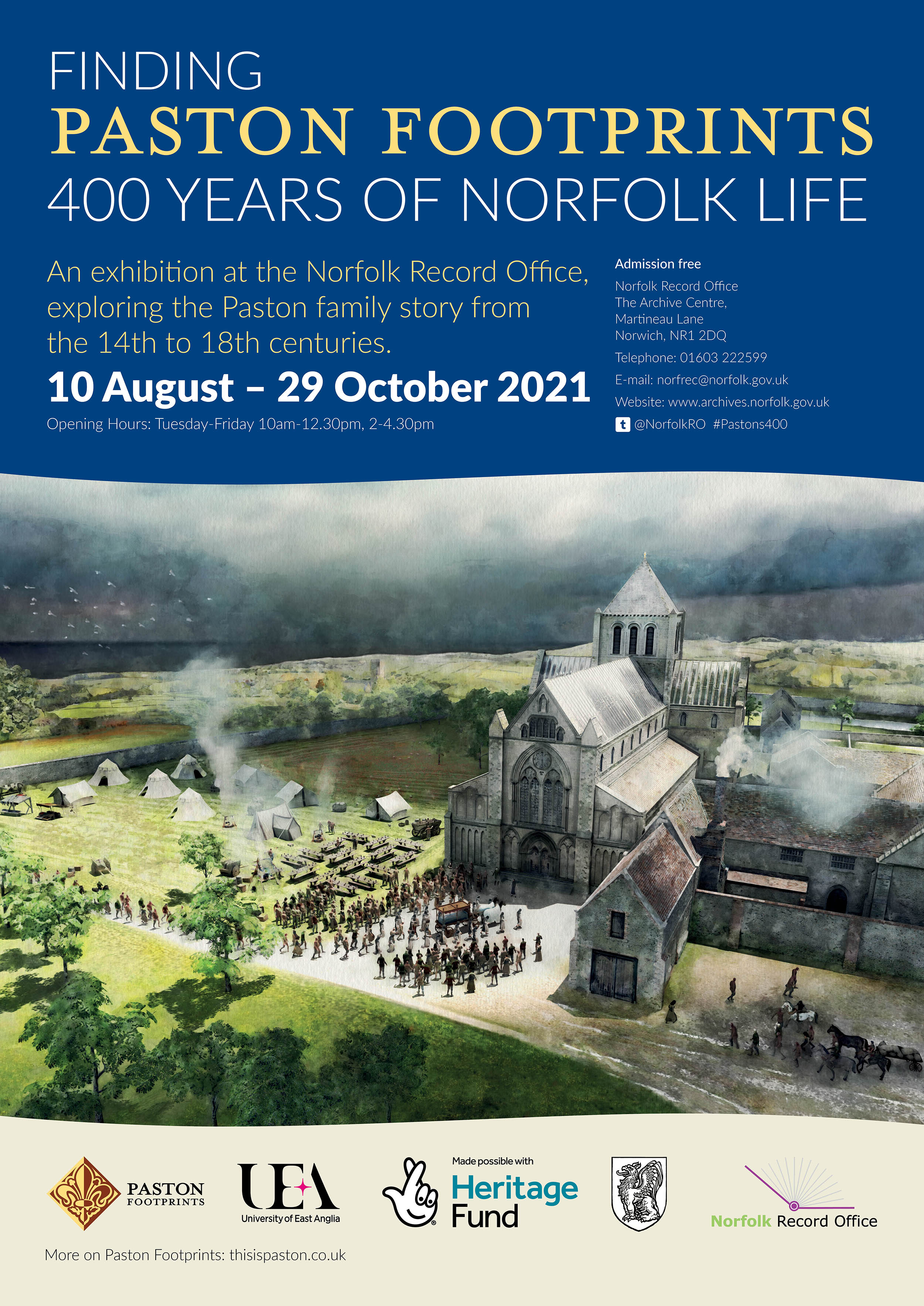 This page provides details about the events which accompany the exhibition Finding Paston Footprints: 400 Years of Norfolk Life, which is taking place at the Norfolk Record Office from Tuesday 10 August to Friday 29 October 2021 Tuesday-Friday 10a.m.-12.30p.m. and 2p.m.-4.30p.m.